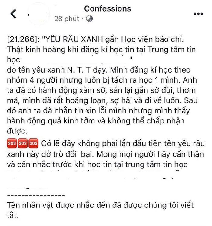 Như thông tin đã đưa, mới đây, một sinh viên của Học viện Báo chí và Tuyên truyền (AJC) cho biết, sau khi đăng ký và đến lớp học theo lịch, cô bị chủ Trung tâm tin học gần trường có tên N.T.T quấy rối. Cụ thể, theo lời nữ sinh, người này đã có những hành vi như “sờ đùi, thơm má” khiến cô hoảng loạn, sợ hãi và phải bỏ về ngay trong tiết học.