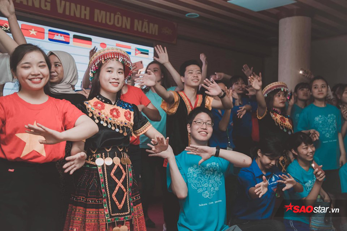 Thể hiện niềm tự hào dân tộc và tình yêu quê hương đất nước, sinh viên Học viện trong trang phục áo cờ đỏ sao vàng đã trình diễn điệu nhảy flasmob trên nền nhạc bài hát “Tên tôi Việt Nam”. Kết thúc chương trình biểu diễn, các đại biểu, sinh viên Học viện và quốc tế cùng hòa nhịp trong điệu nhảy sạp rộn ràng mang đậm nét văn hóa truyền thống của các dân tộc miền núi phía Bắc.