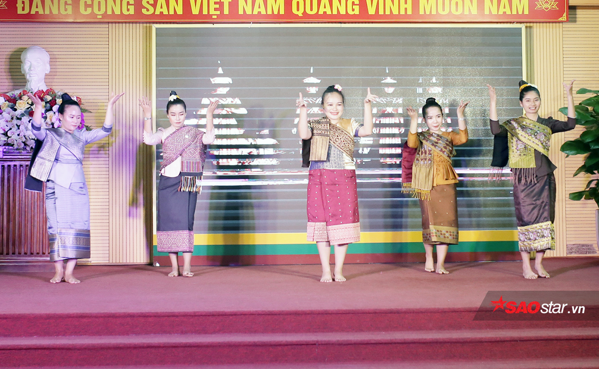 Đan xen giữa những tiết mục biểu diễn sôi động là điệu múa Lăm Vông nhẹ nhàng, duyên dáng của sinh viên Lào…