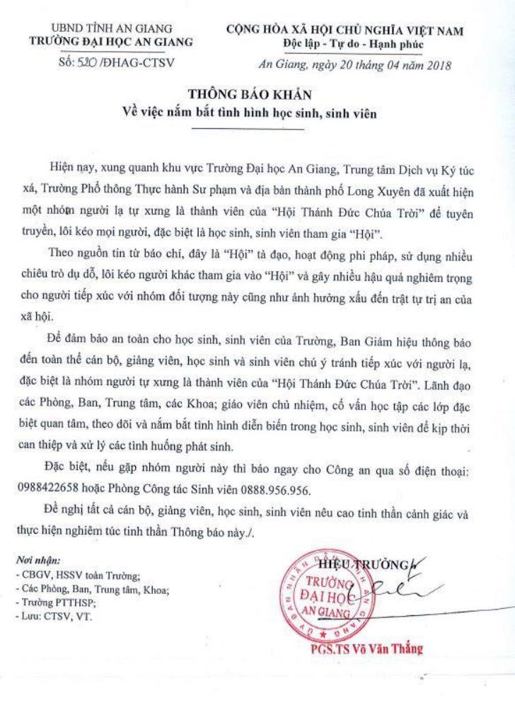 Ngày 21/4 vừa qua, BGH trường Đại học An Giang cũng ra thông báo khẩn sau khi có thông tin một nhóm người lạ tự xưng là thành viên của Hội Thánh Đức Chúa Trời đến tuyên truyền, lôi kéo mọi người, đặc biệt là học sinh, sinh viên tham gia vào hội này ở khu vực trường, Trung tâm Dịch vụ ký túc xá, trường Phổ thông Thực hành sư phạm và địa bàn TP. Long Xuyên.