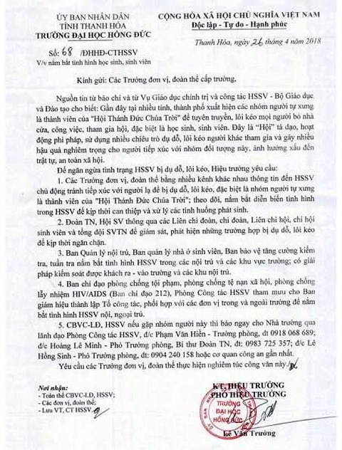 Trường ĐH Hồng Đức gửi thông báo đến các HSSV, các phòng, ban để cảnh giác với các hoạt động của “Hội Thánh Đức Chúa Trời”.