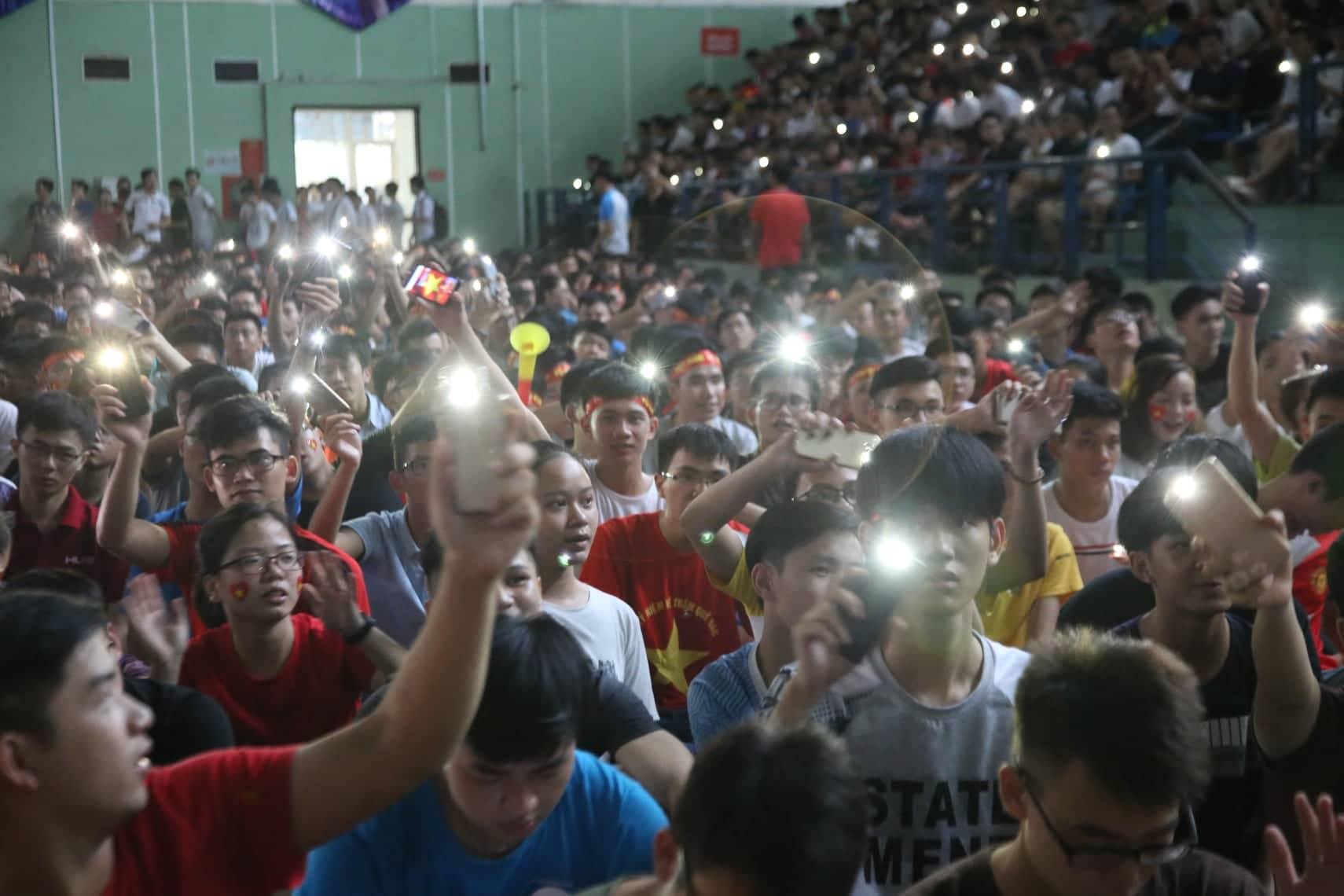 Tại Trung tâm Theo thao Văn hóa (ĐH Bách khoa, Hà Nội), hàng nghìn sinh viên vẫn không ngừng cổ vũ hết mình cho thầy trò HLV Park-Hang-Seo. Không chỉ dừng lại ở việc hô vang “khẩu quyết Việt Nam vô địch”, các bạn sinh viên còn bật hết đèn flash điện thoại, hát vang Quốc ca và bài hát “Đường đến ngày vinh quang”.