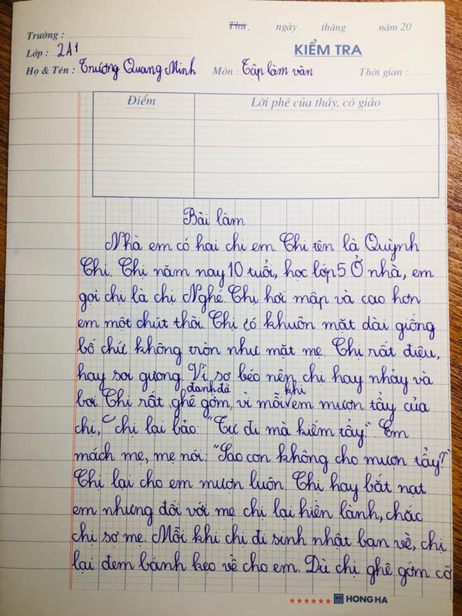 Mới đây, bài văn miêu tả người chị gái của một nam sinh lớp 2 đã “dậy sóng” cộng đồng mạng bởi màn “bóc phốt” hài hước những thói hư, tật xấu của người chị gái. Thế nhưng điều đáng nói phải nhắc đến ở cuối bài khi anh chàng này chốt lại bằng một câu khiến ai nấy cũng bật cười.