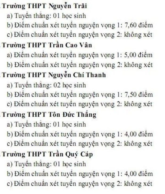 Cụ thể, 3 trường lấy điểm chuẩn là 4 điểm gồm: Trường THPT Tôn Đức Thắng, Trường THPT Trần Quý Cáp (2 trường này không xét nguyện vọng 2), Trường THPT Tô Văn Ơn (điểm xét tuyển nguyện vọng 2 là 7,7). Riêng, trường THPT Đoàn Thị Điểm có điểm chuẩn là 4,2 (điểm xét tuyển nguyện vọng 2 là 7,4).