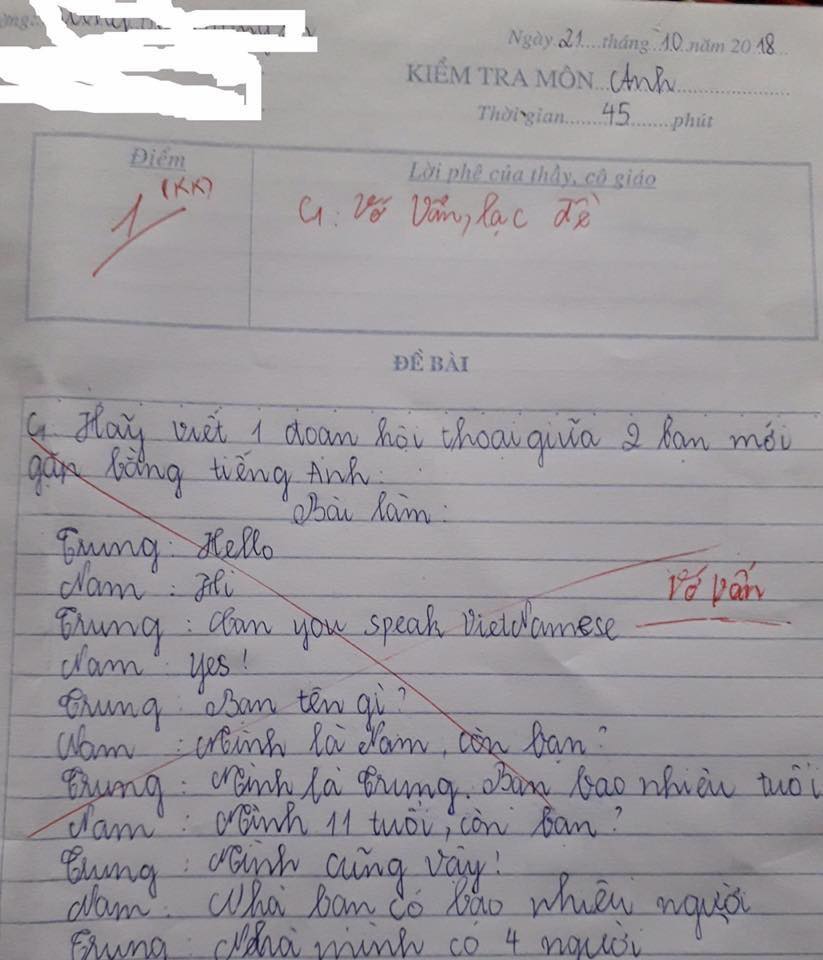 Cụ thể, đề bài kiểm tra là: “Tạo 1 đoạn hội thoại bằng tiếng Anh giữa 2 người mới gặp”. Thực hiện “ý chỉ” của giáo viên, học sinh cặm cụi làm bài. Tuy nhiên, chỉ được 2 câu đầu có vẻ hơi hướng ngoại thì đoạn hội thoại lập tức chuyển thành tiếng Việt.