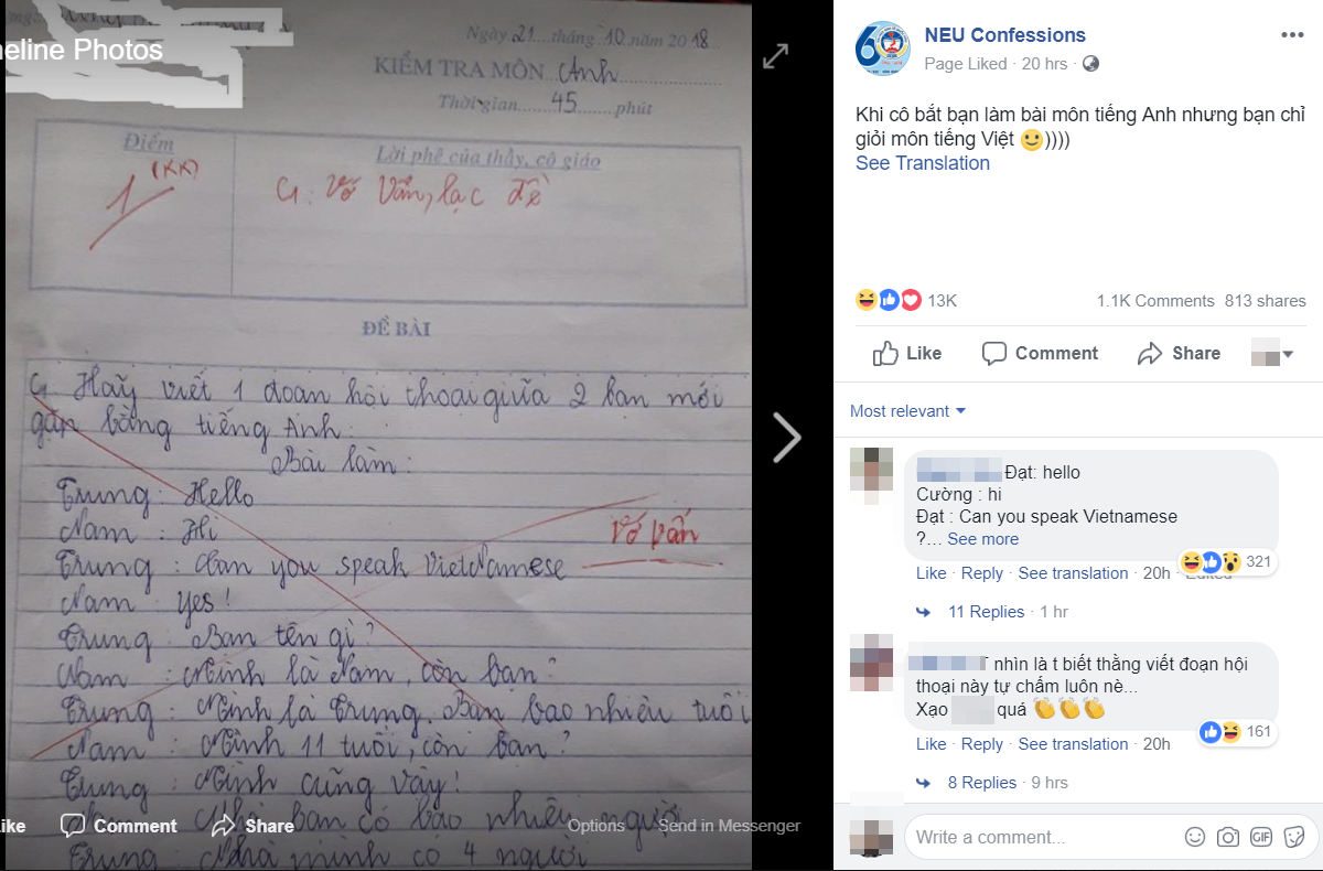 Và thế là từ đây, đoạn hội thoạt bắt đầu trở thành tiếng Việt 100%. Đương nhiên rồi, tại sao 2 người phải nói tiếng Anh trong khi tất cả cùng biết tiếng Việt nhỉ? Câu trả lời trên cả thông minh này của học sinh khiến dân mạng cười ngất. Dù nhận về 1 điểm nhưng ai nấy đều đánh giá hẳn học sinh này có chỉ số IQ rất cao.