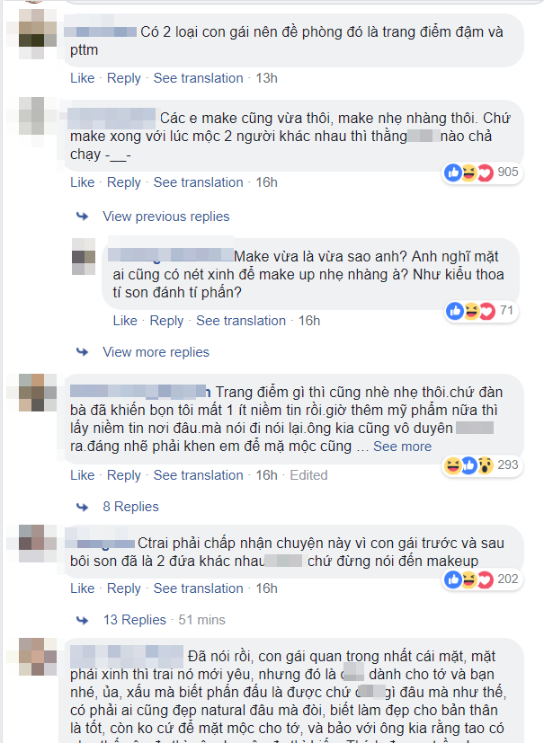 “Đàn ông nên nghiêm túc suy nghĩ về chuyện chấp nhận được hay không. Make up cũng chỉ là cách chị em gây sự chú ý để đàn ông đến tìm hiểu họ còn ai chả biết sớm muộn gì gương mặt mộc cũng sẽ lộ ra. Quan trọng là phẩm cách của người phụ nữ có đủ giữ đàn ông ở lại hay không. Vì thế, có lẽ cánh mày râu nên học cách sống chung với lũ“, một ý kiến khác nêu.