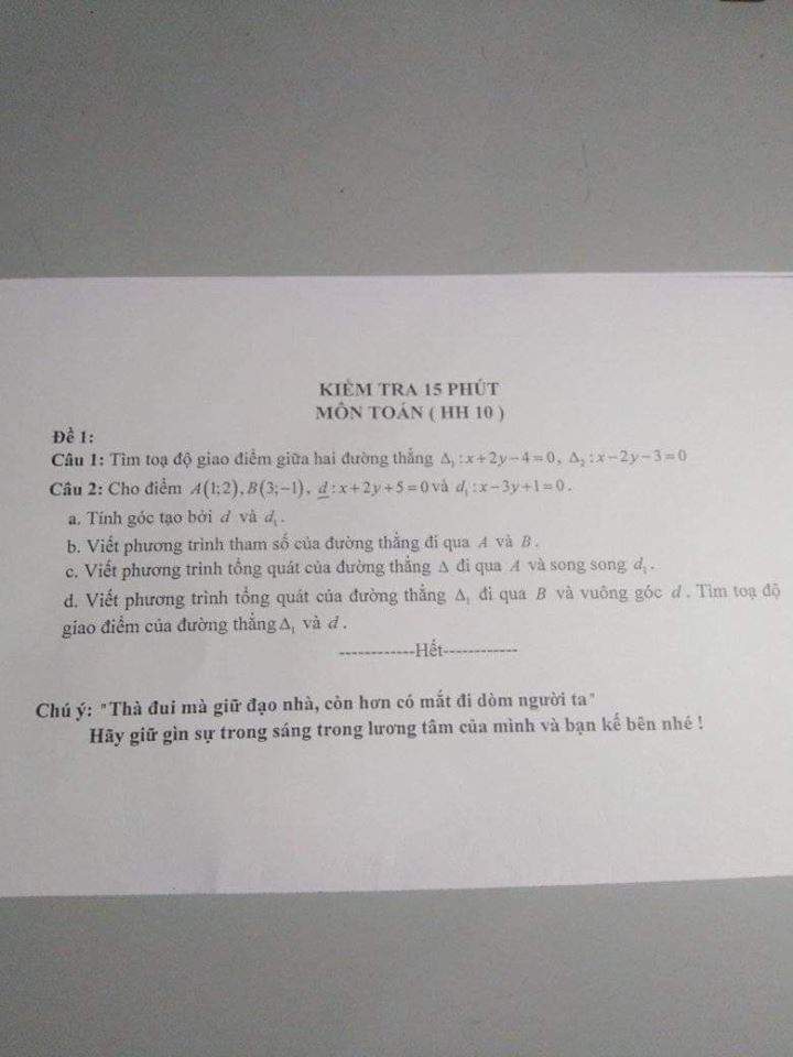 Mới đây, mạng xã hội đang xôn xao trước một đề kiểm tra 15 phút môn toán. Tuy nhiên, điều khiến cư dân mạng chú ý không phải là những bài toán mà là chú thích nho nhỏ của giáo viên bên dưới tờ đề. Cụ thể, cuối bài kiểm tra, giáo viên môn toán buông nhẹ một câu: “Thà đui mà giữ đạo nhà, còn hơn có mắt đi dòm người ta“.