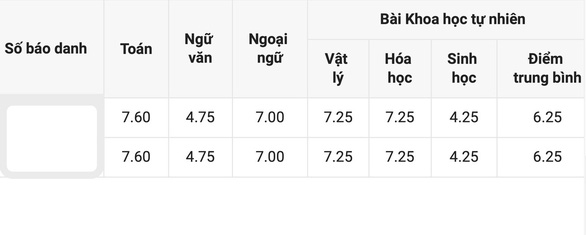 Theo thông tin từ báo Thanh Niên, thí sinh Đ.T.T (hộ khẩu tại tỉnh Tây Ninh, học THPT tại TP.HCM) có điểm thi THPT quốc gia năm nay các môn như sau: toán 7,6; ngữ văn 4,75; vật lý 7,25; hóa học 7,25; sinh học 4,25; khoa học tự nhiên 6,25 và tiếng Anh 7 điểm.
