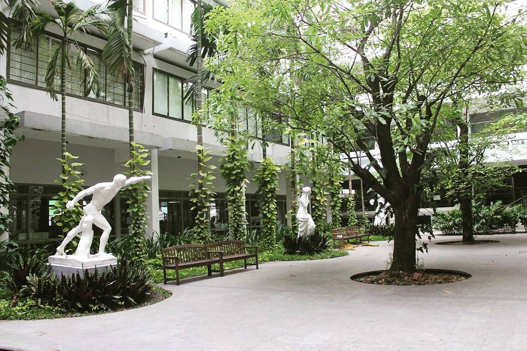 Sân trường với những mảng cây đặt để có tính toán cùng những bức tượng Hy Lạp tạo ra cảm giác như đang lạc bước trong một khu vườn hoàng gia.