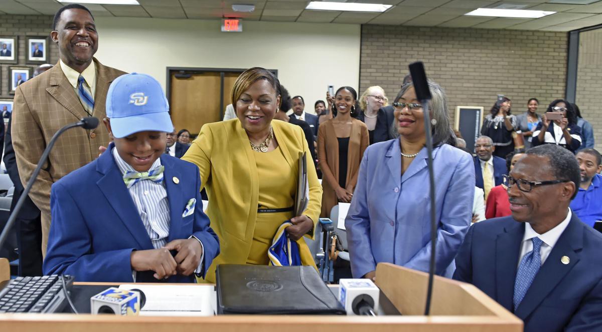 Elijah Precciely chia sẻ trước hội đồng quản trị trường và gia đình: “Em muốn cảm ơn những người đã tạo điều kiện cho sự học của mình. Học bổng em nhận được là câu trả lời cho những lời cầu nguyện của bản thân với mối lo lắng về khoản nợ đại học.”