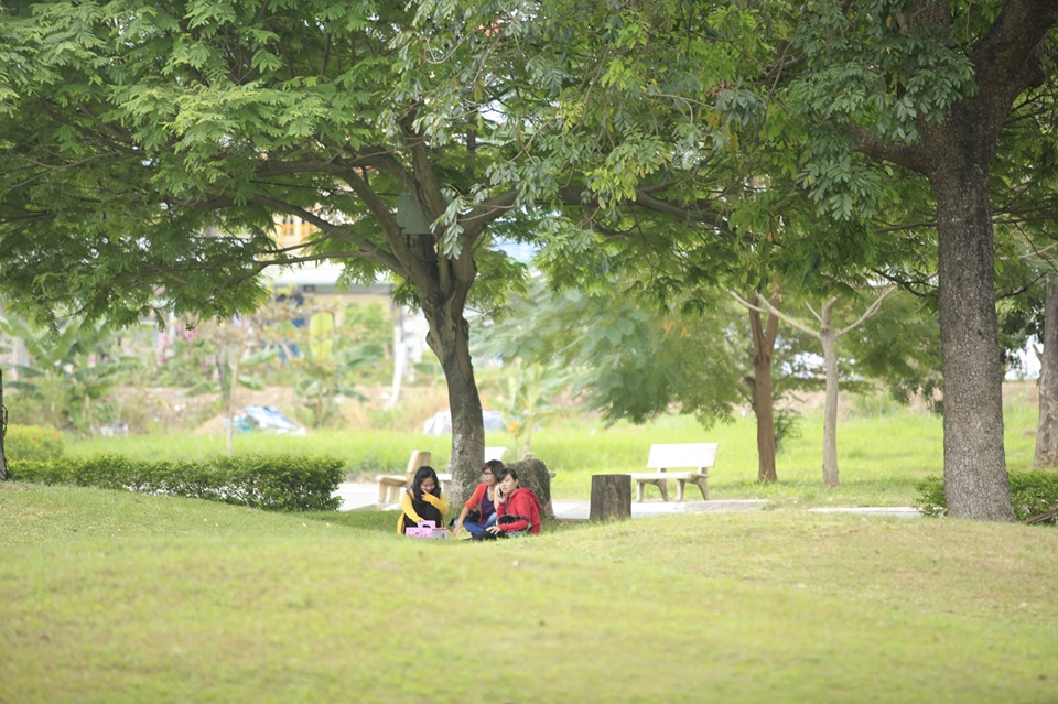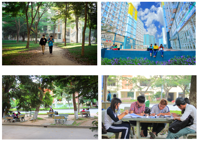 Những mảng xanh được bố trí khắp nơi để sinh viên có thể tụ họp bạn bè, tổ chức các buổi dã ngoại, party ngoài trời sau những giờ học tập, làm việc căng thẳng