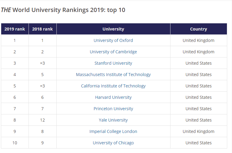 Trong top 10, Mỹ áp đảo với 7 đại học, Đại học Stanford của Mỹ đứng thứ ba. Đại học Yale có bước nhảy vọt từ vị trí 12 lên 8. Xét theo danh sách đầy đủ của bảng xếp hạng (1.258 đại học), Mỹ cũng có nhiều đại diện nhất với tổng cộng 172 trường.