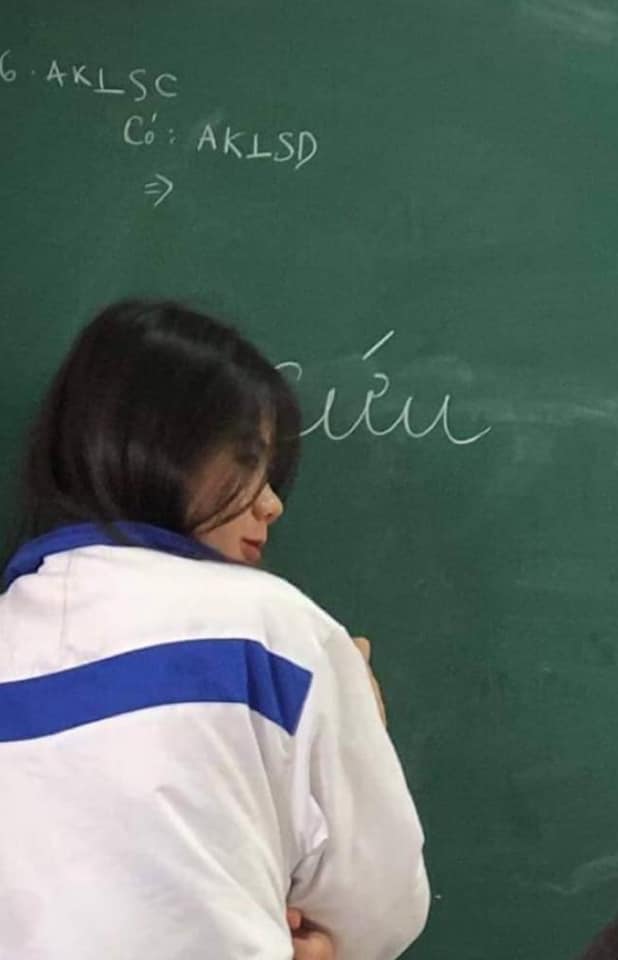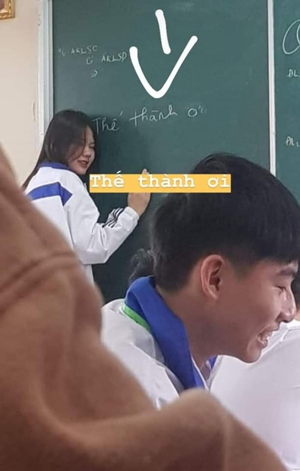 Cụ thể, chắc có lẽ cô bạn này rơi vào “quả bí” với bài tập trên bảng nên đã nhờ đến sự hỗ trợ của một cậu bạn bên dưới lớp. Nữ sinh viết: “Thế Thành ơi”…”Cứu”. “Tiếng kêu” thân thiết ấy kết hợp với khuôn mặt “đáng thương” của bạn gái lúc này đã khiến cư dân mạng được một phen cười rụng rốn.