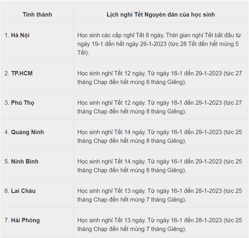 UBND TP Hà Nội đã đồng ý cho học sinh nghỉ Tết 8 ngày theo đề xuất của Sở GD&ĐT TP.HCM. Thời gian nghỉ Tết bắt đầu từ ngày 19-1 đến hết ngày 26-1-2023 (tức 28 Tết đến hết mùng 5 Tết).