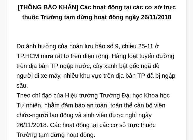 Thông báo nghỉ học nêu rõ: “Nhằm đảm bảo an toàn, toàn thể cán bộ viên chức, người lao động và sinh viên Trường ĐH Khoa học tự nhiên được nghỉ ngày 26.11. Các hoạt động tại các cơ sở trực thuộc trường cũng tạm dừng hoạt động”.