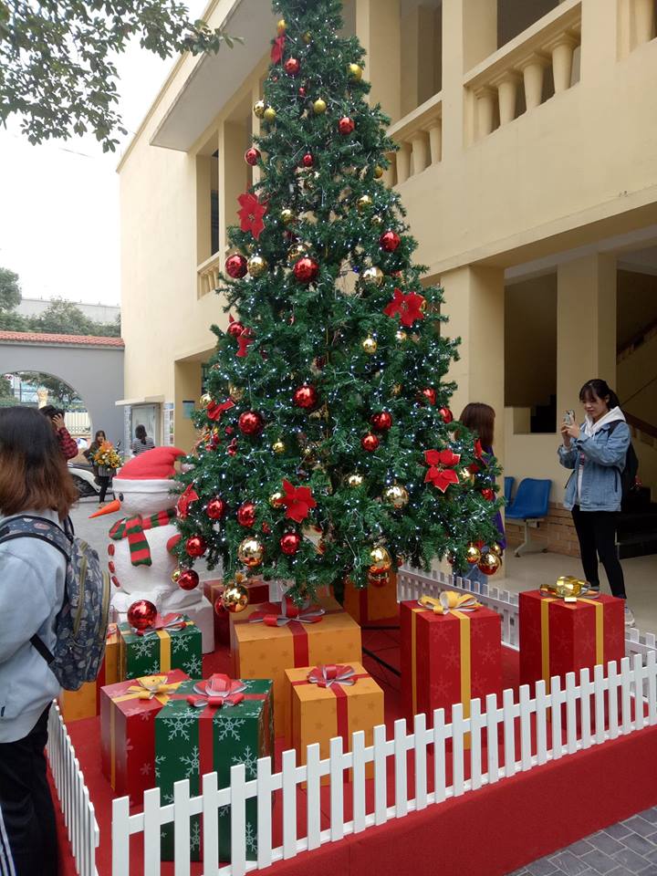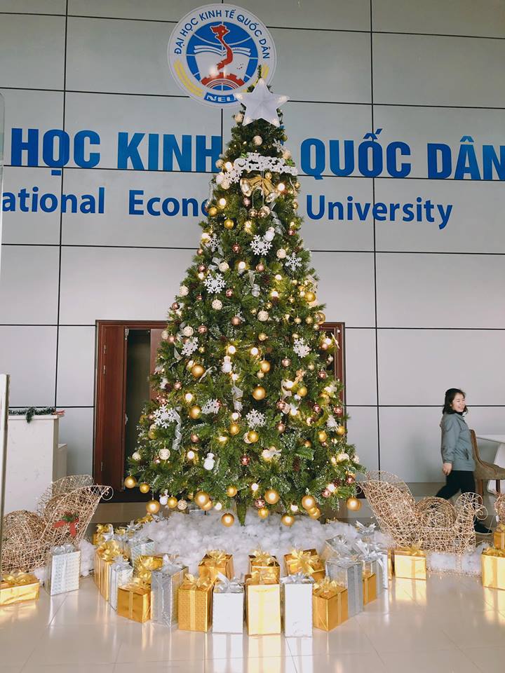 Đại học Kinh Tế Quốc Dân cũng tưng bừng không kém, một cây thông cao vút được đặt ngay tại tòa nhà thế kỉ của trường. Những hộp quà nhỏ xinh được xếp đầy xung quanh khiến không gian trở nên đầy màu sắc sẵn sàng chào đón một mùa giáng sinh mới đến.