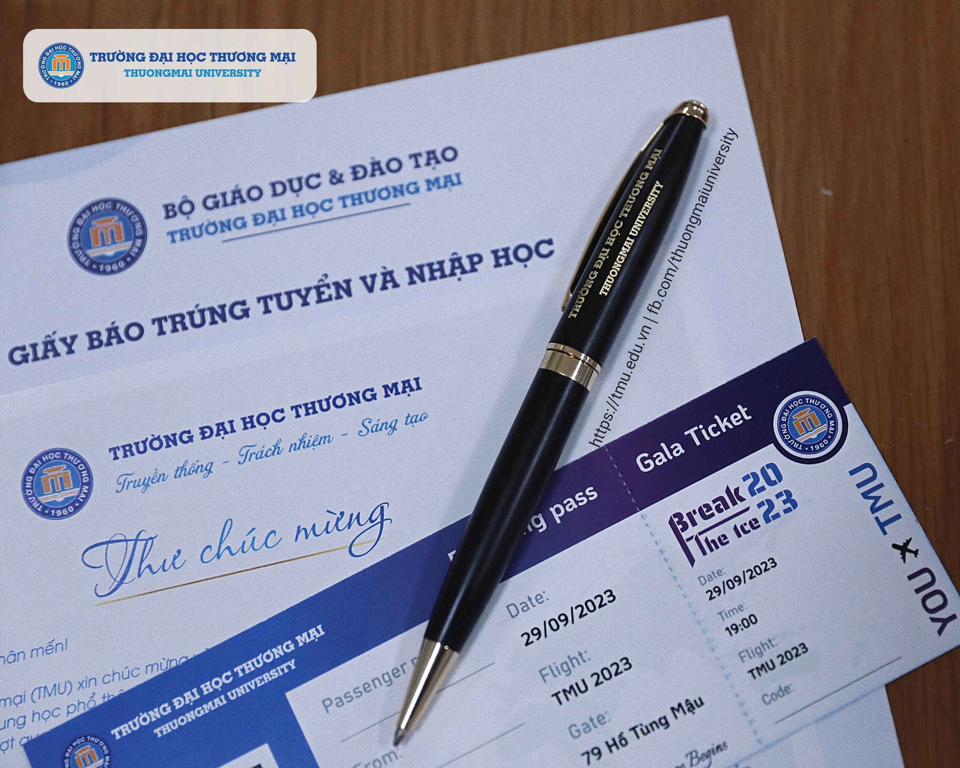 Đại học Thương mại ngoài thư chúc mừng quen thuộc của Hiệu trưởng còn có "tấm vé máy bay" xịn xò tới trường. Đây là còn là tấm dành riêng cho K59 của trường đến với đêm gala chào tân sinh viên.