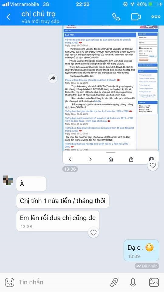 Sau khi nhận được thông báo về việc tiếp tục nghỉ học từ khách thuê trọ, chị chủ này quyết định chơi lớn khi chỉ tính tiền nửa tháng thuê nhà. Bên cạnh đó còn căn dặn bạn này khi nào lên ở rồi đưa sau cũng được