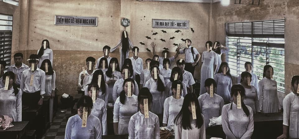 Với đồng phục học sinh kết hợp với cách điều chỉnh tone màu sáng - tối, những cô cậu học trò nơi đây đã khiến người xem liên tưởng đến các lớp học “ma quỷ” xuất hiện trên các bộ phim điện ảnh kinh dị.