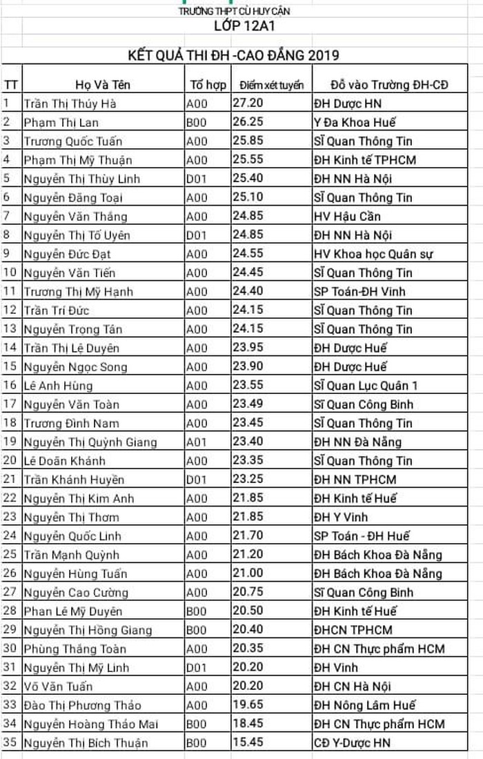 Kết quả đậu ĐH - CĐ của 35 học sinh Lớp 12A1 - Trường THPT Cù Huy Cận