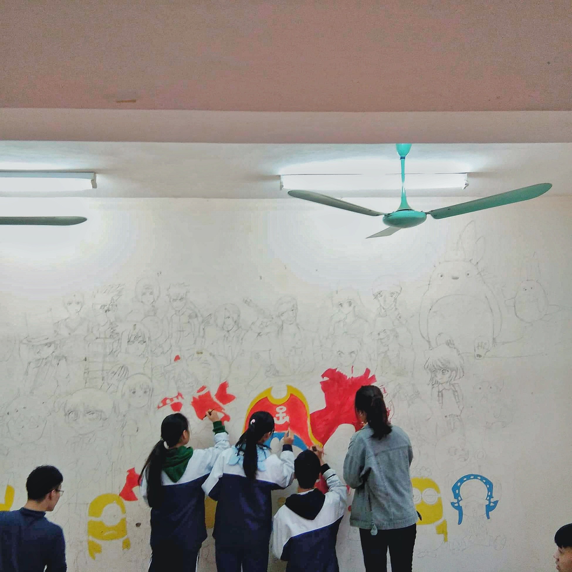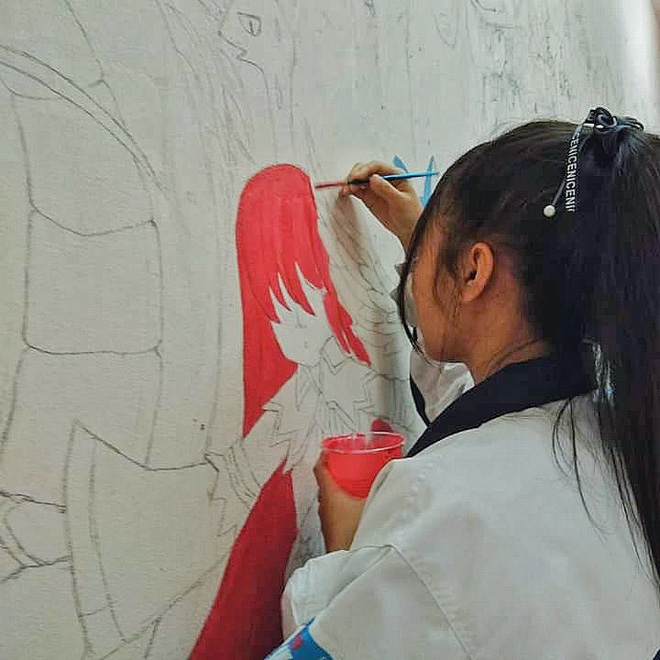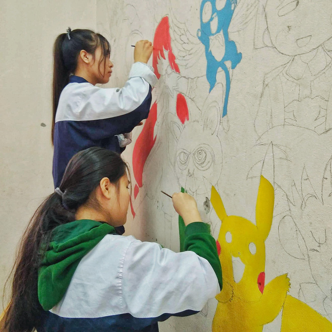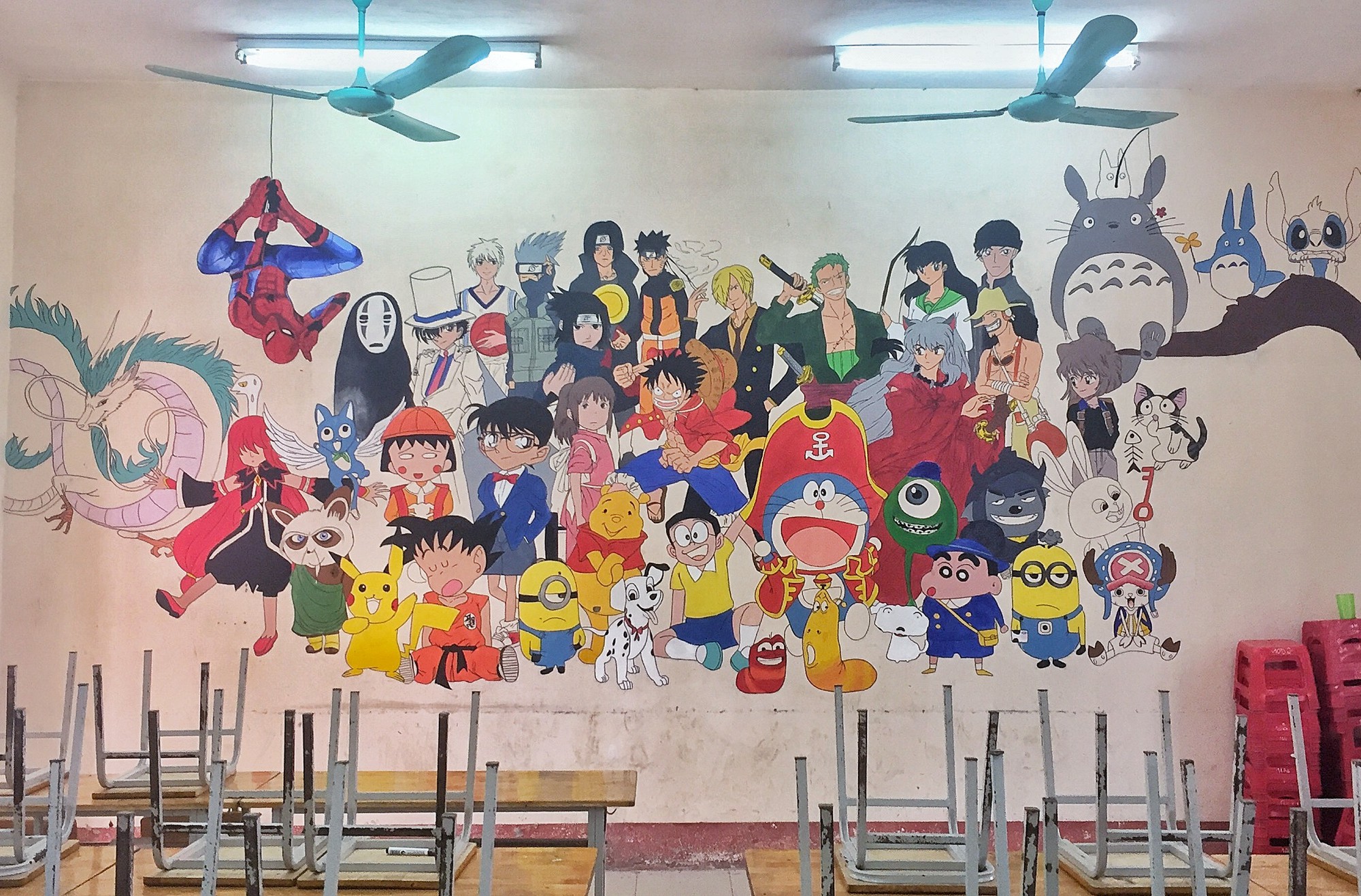 Cụ thể, khoảng 6 bạn có hoa tay nhất lớp được cử ra để vẽ phác thảo, còn tất cả những thành viên còn lại mỗi người đều tự đảm nhận công việc tô màu cho nhân vật của riêng mình. Từ chú mèo máy Doraemon, thám tử lừng danh Conan, Shin cậu bé bút chì đến Luffy mũ rơm, Spiderman, Inuyasha…, mỗi nhân vật chứa đầy ký ức tuổi thơ này đều đại diện cho một thành viên trong lớp với nét tính cách đặc trưng riêng biệt.