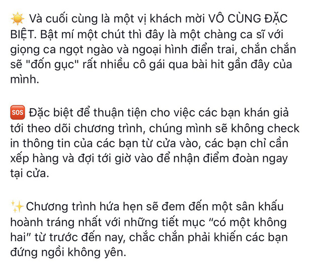 Trước đó, trên fanpage, ban tổ chức đã thông tin khẳng định rằng sẽ có sự góp mặt của “một vị khách mời VÔ CÙNG ĐẶC BIỆT. Bật mí một chút thì đây là một chàng ca sĩ với giọng ca ngọt ngào và ngoại hình điển trai, chắn chắn sẽ “đốn gục” rất nhiều cô gái qua bài hit gần đây của mình”.