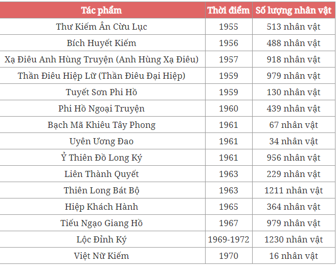 Sự nghiệp sáng tác của Kim Dung có thể nói là thăng hoa từ khá sớm. Đến năm 1955 (năm ông 31 tuổi), khi đang làm việc tại Tân Văn Báo (Hồng Kông), Kim Dung cho ra mắt cuốn tiểu thuyết võ hiệp đầu tay là Thư Kiếm Ân Cừu Lục. Năm 1972 khi kết thúc việc sáng tác văn học, ông đã có trong tay 15 tác phẩm được xếp vào dạng kinh điển.