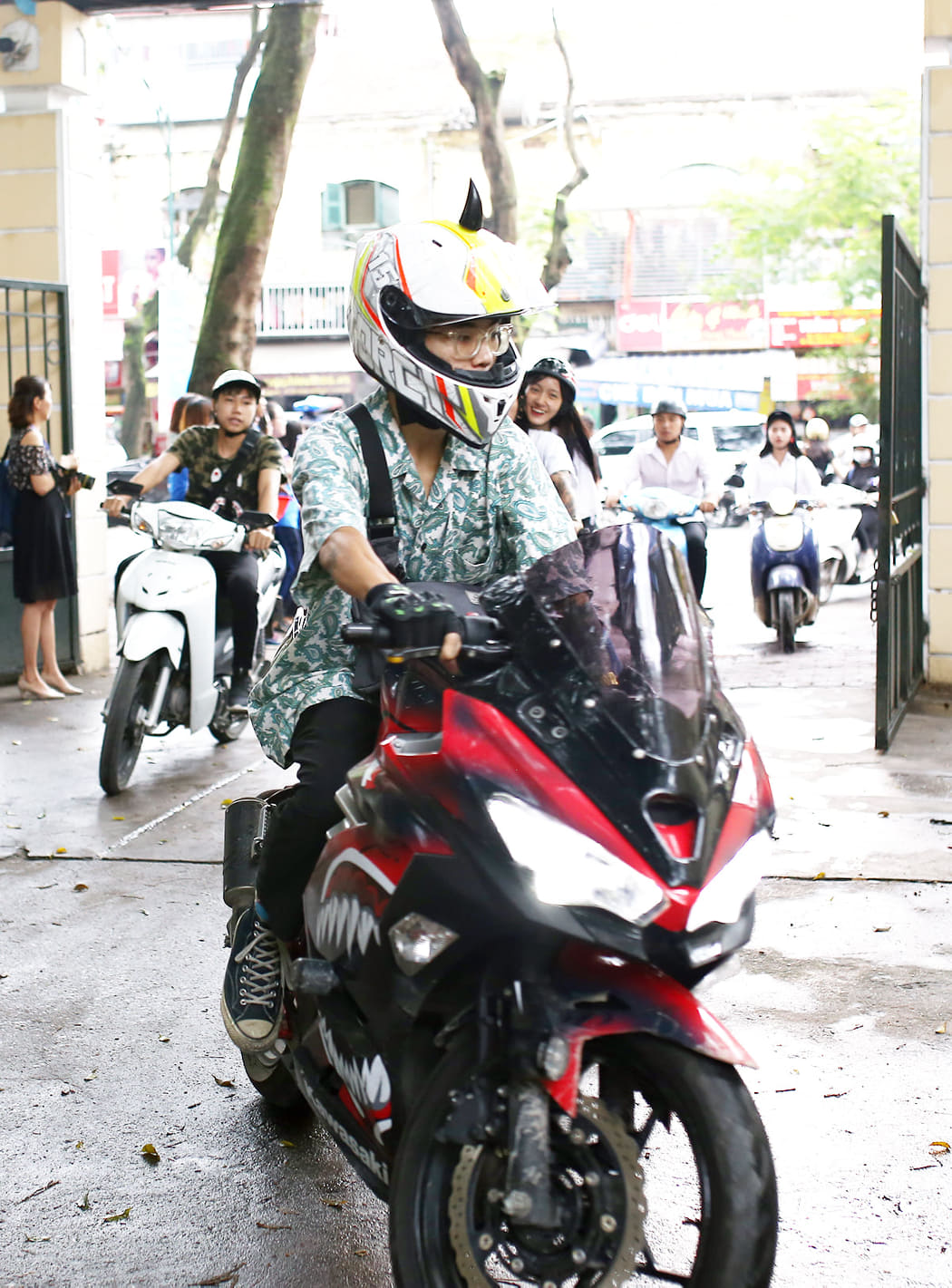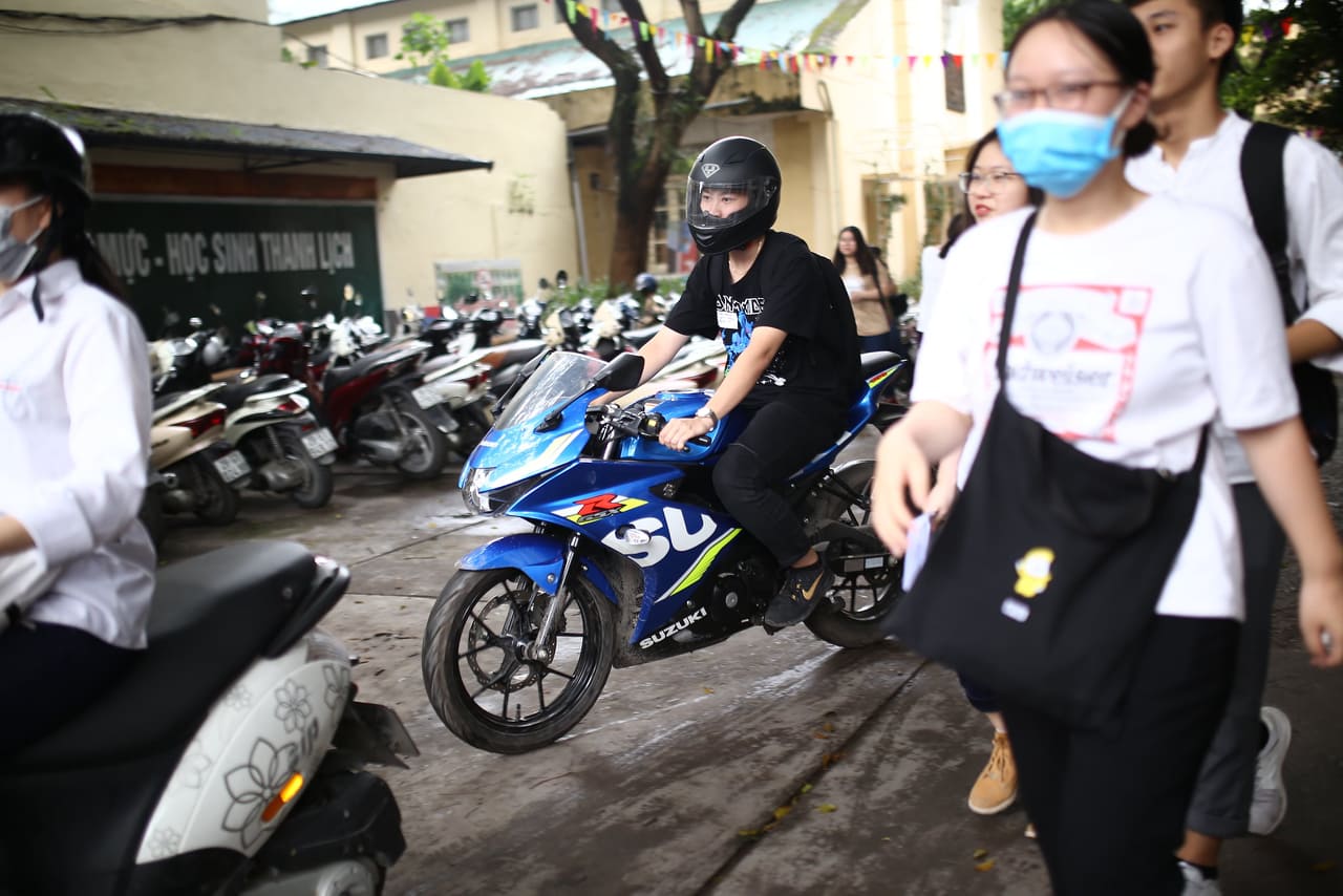 Thí sinh tự lái mô tô đến điểm thi tại THPT Việt Đức.