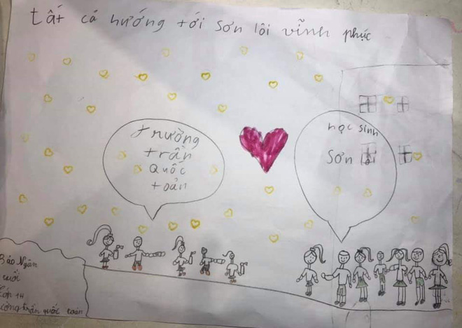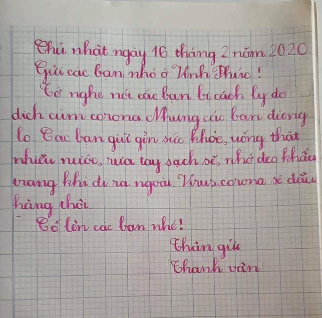 Được biết, trong khoảng thời gian học trò vẫn đang nghỉ học, cô giáo chủ nhiệm của lớp là cô Nguyễn Cẩm Ly đã ra đề bài: “Các con hãy viết một bức thư hoặc vẽ tranh để bày tỏ tình cảm với những bạn nhỏ ở Vĩnh Phúc, nơi đang bị cách ly vì dịch Corona”. Những bức thư do chính tay các bạn học sinh hoàn thành sau đó đã khiến cho cô giáo này không khỏi bất ngờ và xúc động.