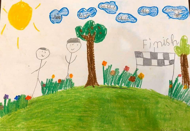 Những món quà tinh thần này là do các em học sinh đến từ lớp 1H, trường Tiểu học Trần Quốc Toản (quận Hoàn Kiếm, Hà Nội) thực hiện. Tuy chưa được hoàn thiện cho lắm, thế nhưng tình yêu thương của các bạn nhỏ nơi thủ đô dường như đã đong đầy và đặt trọn vào trong từng nét bút, mảng màu, tất cả đã tạo thành sức mạnh tinh thần cực lớn gửi đến những người đang nằm trong “tâm dịch”, từ đó có thêm động lực tinh thần để vượt qua quãng thời gian khó khăn hiện tại.