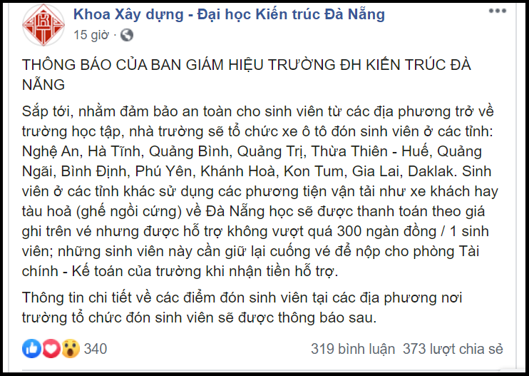 Theo đó nhằm đảm bảo an toàn cho sinh viên từ các địa phương trở về trường học tập, trường ĐH Kiến trúc Đà Nẵng sẽ tổ chức xe ô tô đón sinh viên ở các tỉnh Nghệ An, Hà Tĩnh, Quảng Bình, Quảng Trị, Thừa Thiên - Huế, Quảng Ngãi, Bình Định, Phú Yên, Khánh Hòa, Kon Tum, Gia Lai, Đăk Lăk. Thông tin chi tiết về các điểm đón sinh viên tại các địa phương sẽ được nhà trường thông báo sau.