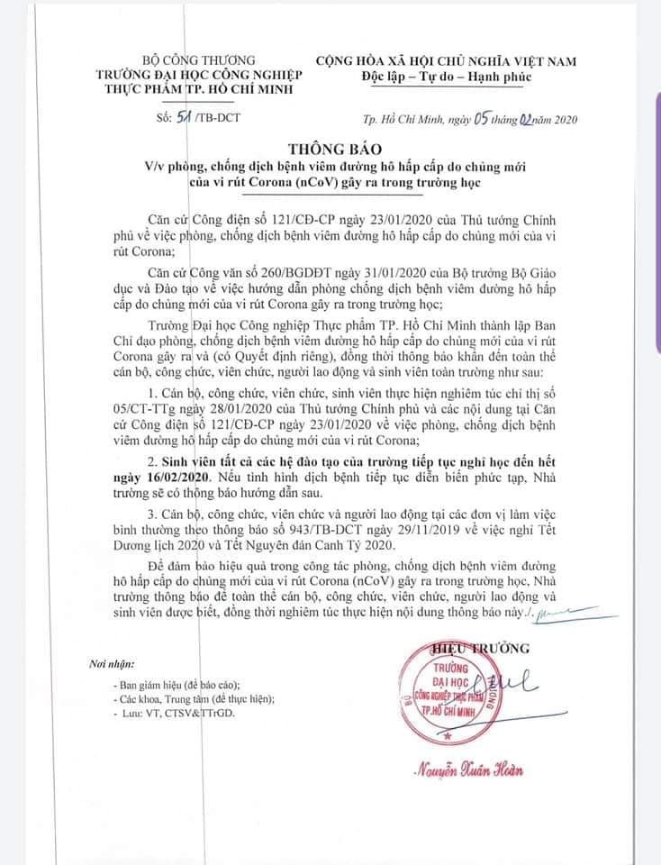 Trường Đại học Công nghiệp Thực phẩm TP.HCM cũng là trường đầu tiên ở phía Nam “khai hỏa” cho sinh viên kéo dài đợt nghỉ của mình. Tương tự như trường Đại học Luật Hà Nội và trường Đại học Sư phạm Hà Nội 2, sinh viên của trường Đại học Công nghiệp Thực phẩm TP.HCM cũng sẽ tiếp tục được nghỉ đến hết ngày 16/2 cho đến khi có thông báo mới.