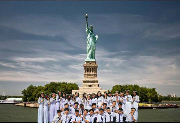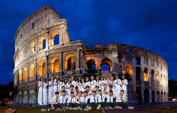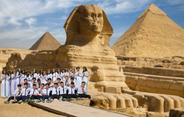 Không tốn kém, không mất nhiều thời gian, chỉ cần vài thao tác, bạn thích đi đâu cũng được, thích chụp ảnh ở đâu cũng xong. Với một bức ảnh tập thể lớp, các bạn học sinh đã ghép cả lớp vào những địa điểm nổi danh trên thế giới.
