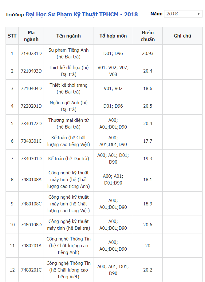Dưới đây là bảng điểm chuẩn của ĐH Sư phạm Kỹ thuật TP.HCM: