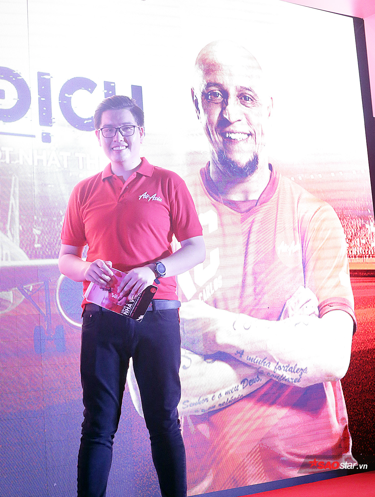 Vũ Trần Nam Linh tự tin đứng chung sân khấu với nam danh thủ Roberto Carlos. Anh thể hiện khả năng tiếng Anh trôi chảy khi tự mình đặt câu hỏi cho cựu cầu thủ Brazil và dịch Anh - Việt cho các khán giả.