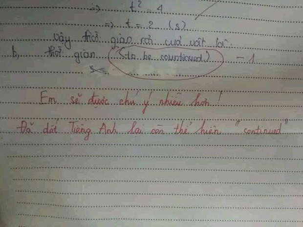 Khi chấm bài, thầy giáo đã chỉ ra lỗi sai cơ bản của cậu bạn rồi viết lời phê cực phũ phàng: “Đã dốt tiếng Anh lại còn thể hiện “continued”. Em sẽ được chú ý nhiều hơn!”.