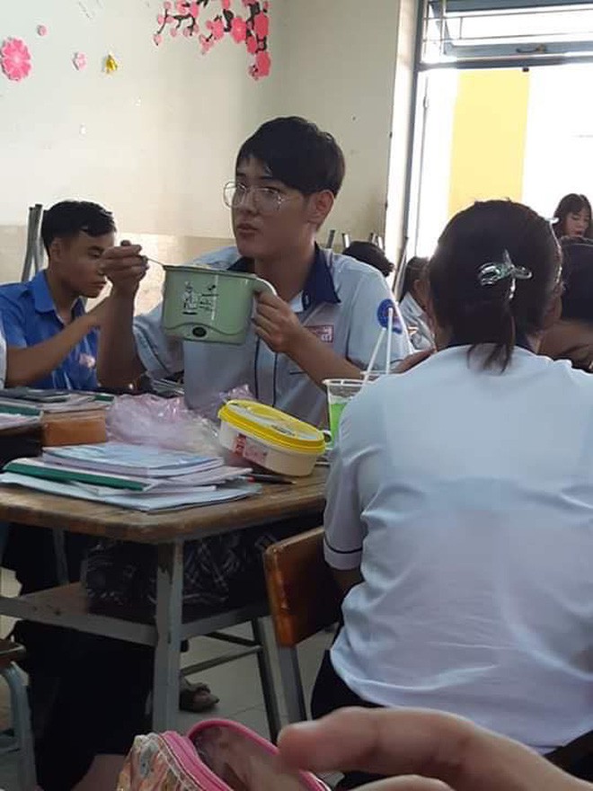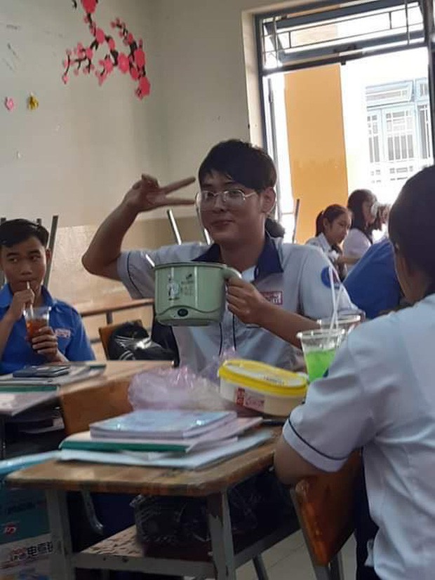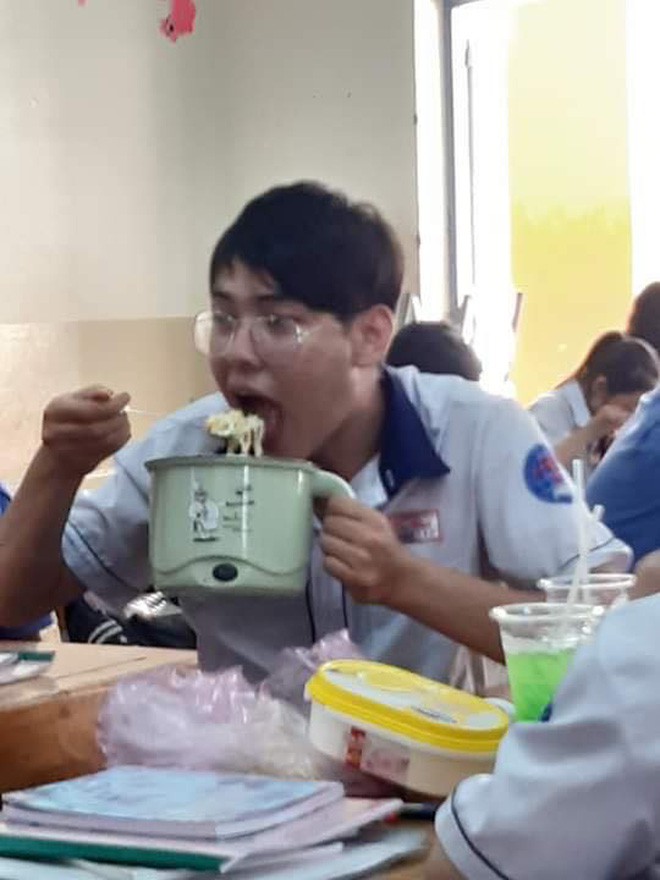 Không chỉ đơn thuần là các món ăn vặt mà chúng ta vẫn thường thấy hằng ngày như bánh, kẹo, trái cây,…mà cậu bạn này quyết định “chơi lớn”, đem cả một nồi mì vào tận trường học.