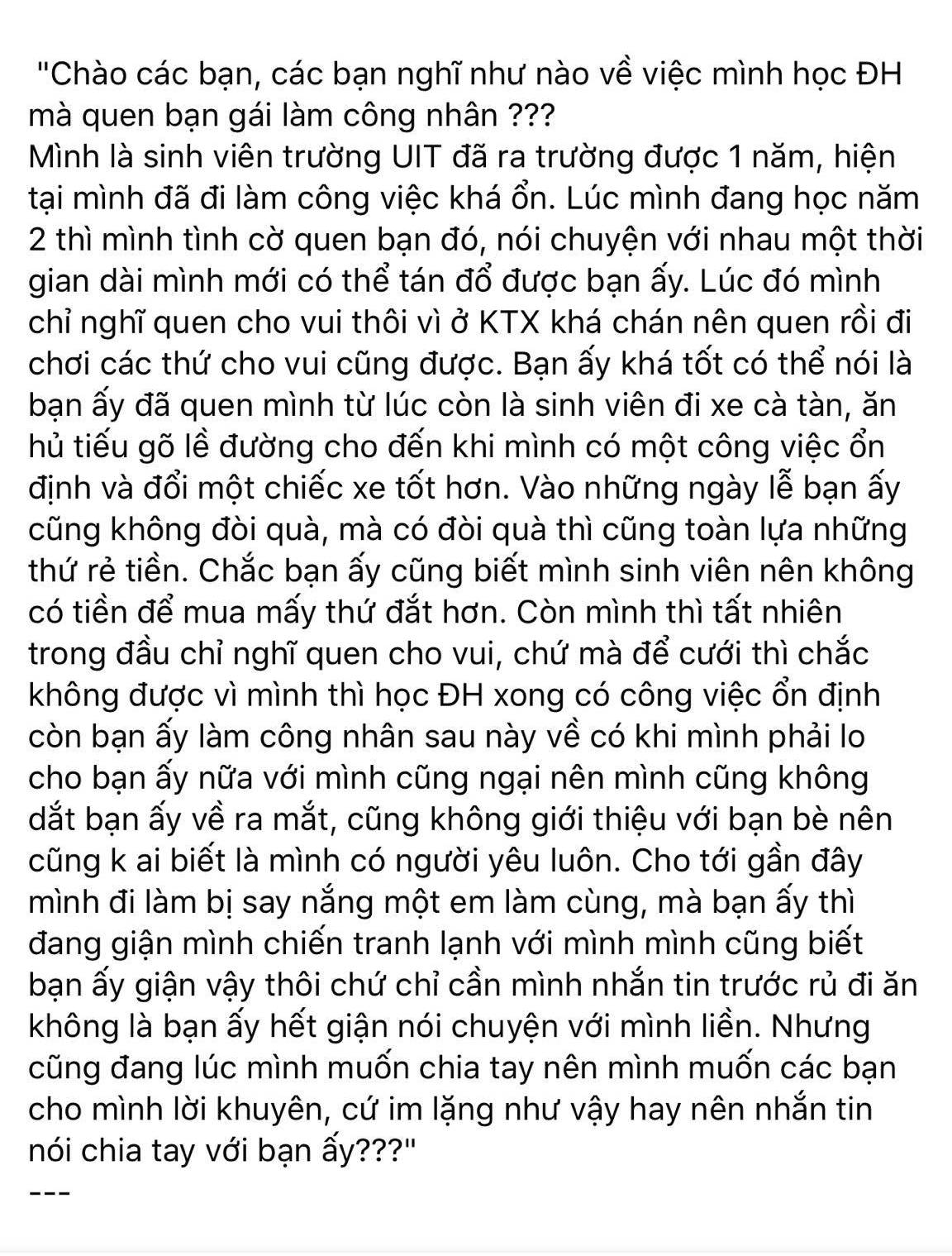 Mới đây, trên một hội nhóm dành riêng cho các bạn Sinh viên, một nam sinh vừa chia sẻ câu chuyện tình yêu của mình đã nhận được nhiều sự quan tâm của CĐM. Theo đó, cậu bạn và người yêu đã có những năm tháng tuyệt đẹp, trải qua bao nhiêu khó khăn, thăng trầm. Thế nhưng, đến nay, khi cậu bạn đã ra trường và có công việc ổn định thì lại muốn chia tay với bạn gái chỉ vì cô bạn là… công nhân.