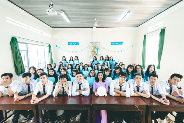 Em Minh (thứ 3 bên phải sang) cùng cô giáo chủ nhiệm và lớp 12B1