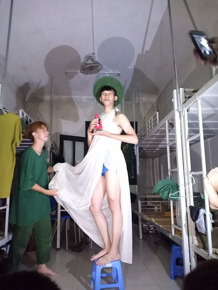 Mới đây, trên Group USSH - HUS Confessionvừa chia sẻ hình ảnh của nam sinh trường Đại học Khoa học Tự nhiên hóa trang giả gái trong kì quân sự khiến ai cũng phải “phì cười”. Cụ thể, màn hóa trang này đã được bạn cùng phòng giúp đỡ với các đạo cụ như chăn, màn và mũ khiến nam sinh trở thành một cô gái vô cùng quyến rũ. Chiếc màn trắng giờ đây đã trở thành chiếc váy cực kì gợi cảm.