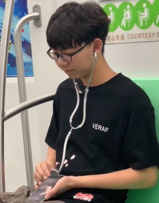 Theo đó, ở nơi công cộng có đông người, nam sinh này bất ngờ lấy ống nghe nhịp tim gắn vào tai và phiêu theo điệu nhạc khiến nhiều người phải chú ý.