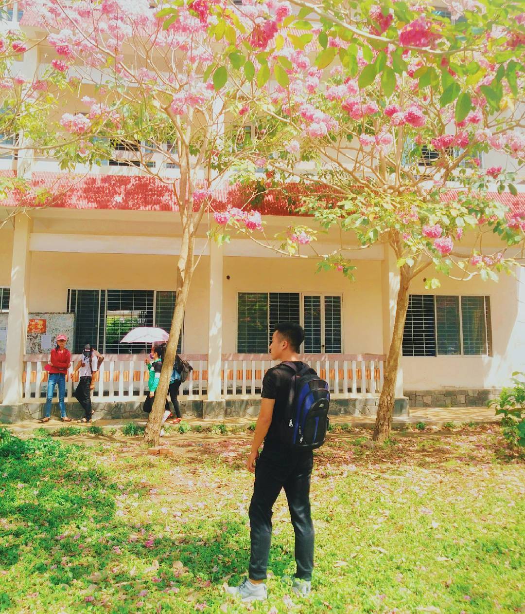 Không chỉ các bạn nữ mới mê chụp ảnh với hoa kèn hồng đâu nha, nhiều nam sinh cũng chịu khó tạo dáng dưới hoa lắm đấy.
