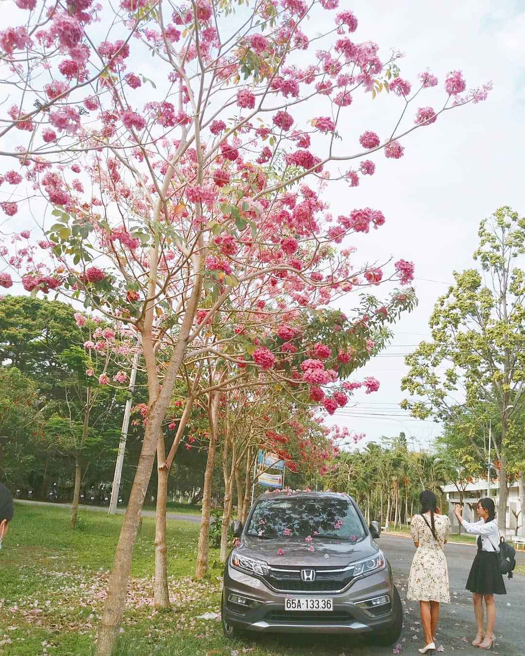 Một dãy kèn hồng nở rộ rực rỡ cả góc trời khiến ai cũng muốn lưu lại vài tấm ảnh kỷ niệm.