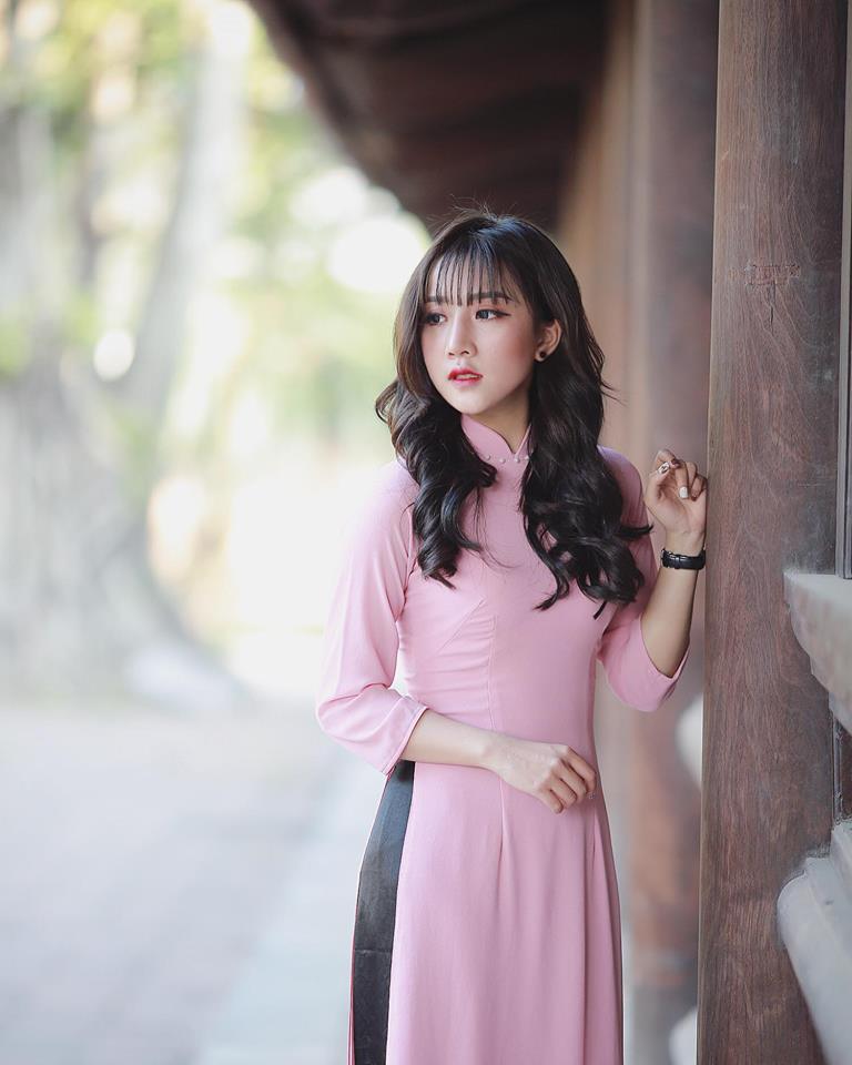 Nữ sinh nền nã với áo dài hồng.