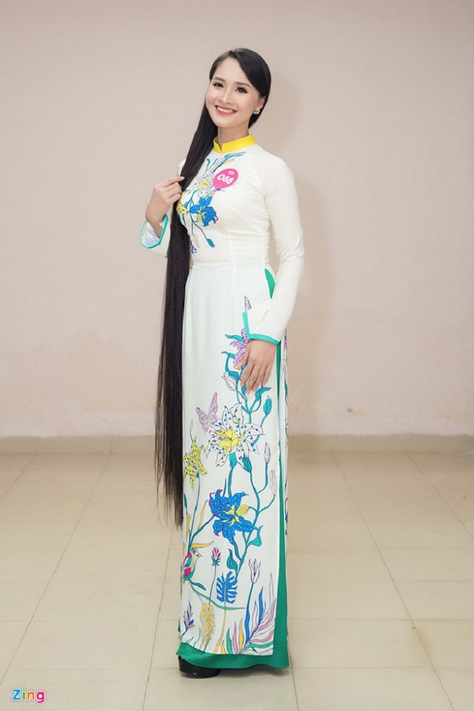 Nguyễn Thị Khánh Linh (21 tuổi, sinh viên Đại học Quốc gia Hà Nội) nổi bật vì mái tóc dài 1,4 m. Cô tiết lộ cả nhà có truyền thống để tóc dài và cô chưa bao giờ có ý định để kiểu tóc nào khác. Hoa hậu Việt Nam 2018 là cuộc thi sắc đẹp đầu tiên mà cô tham gia. Ảnh: Zing.vn.