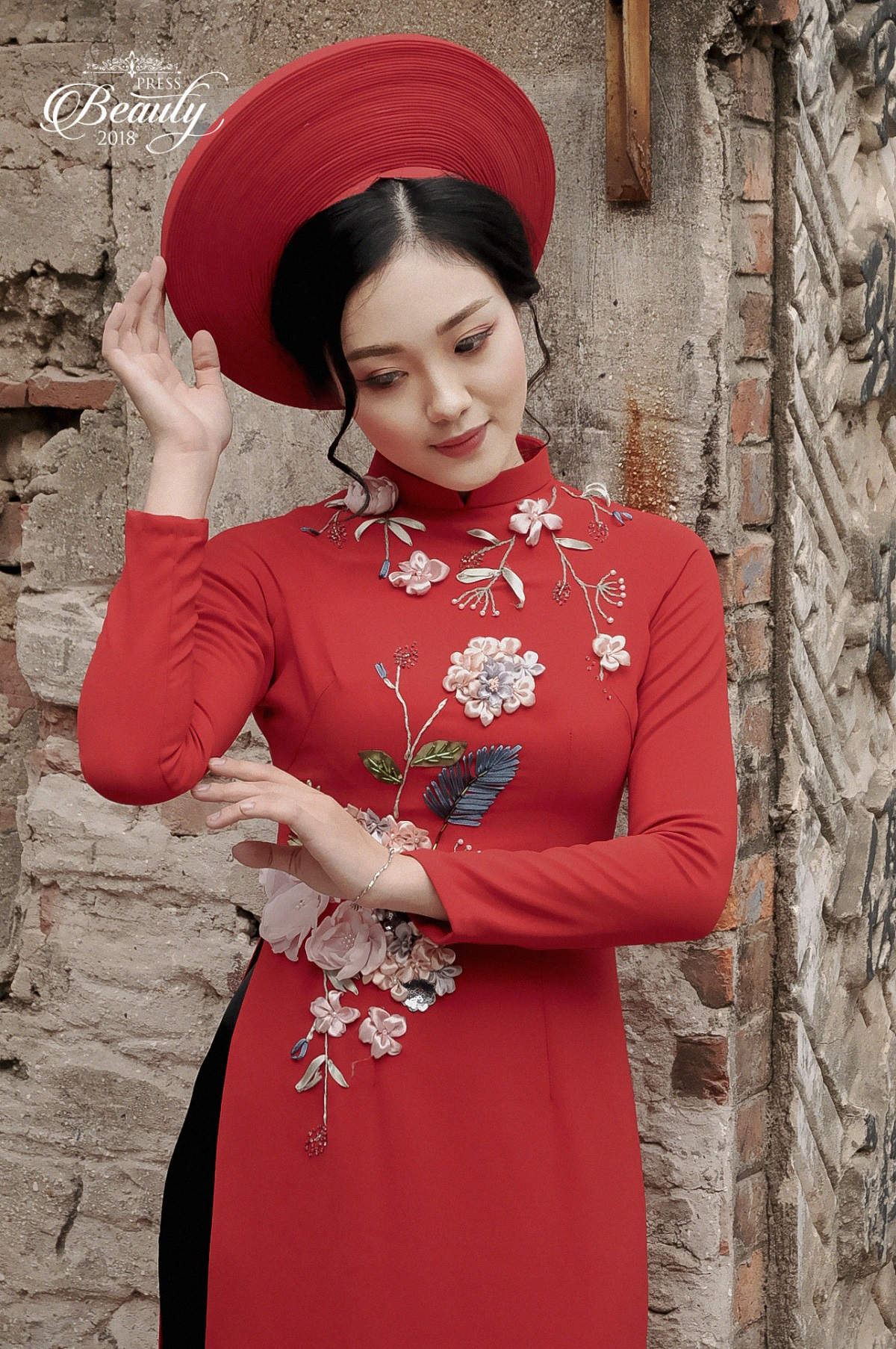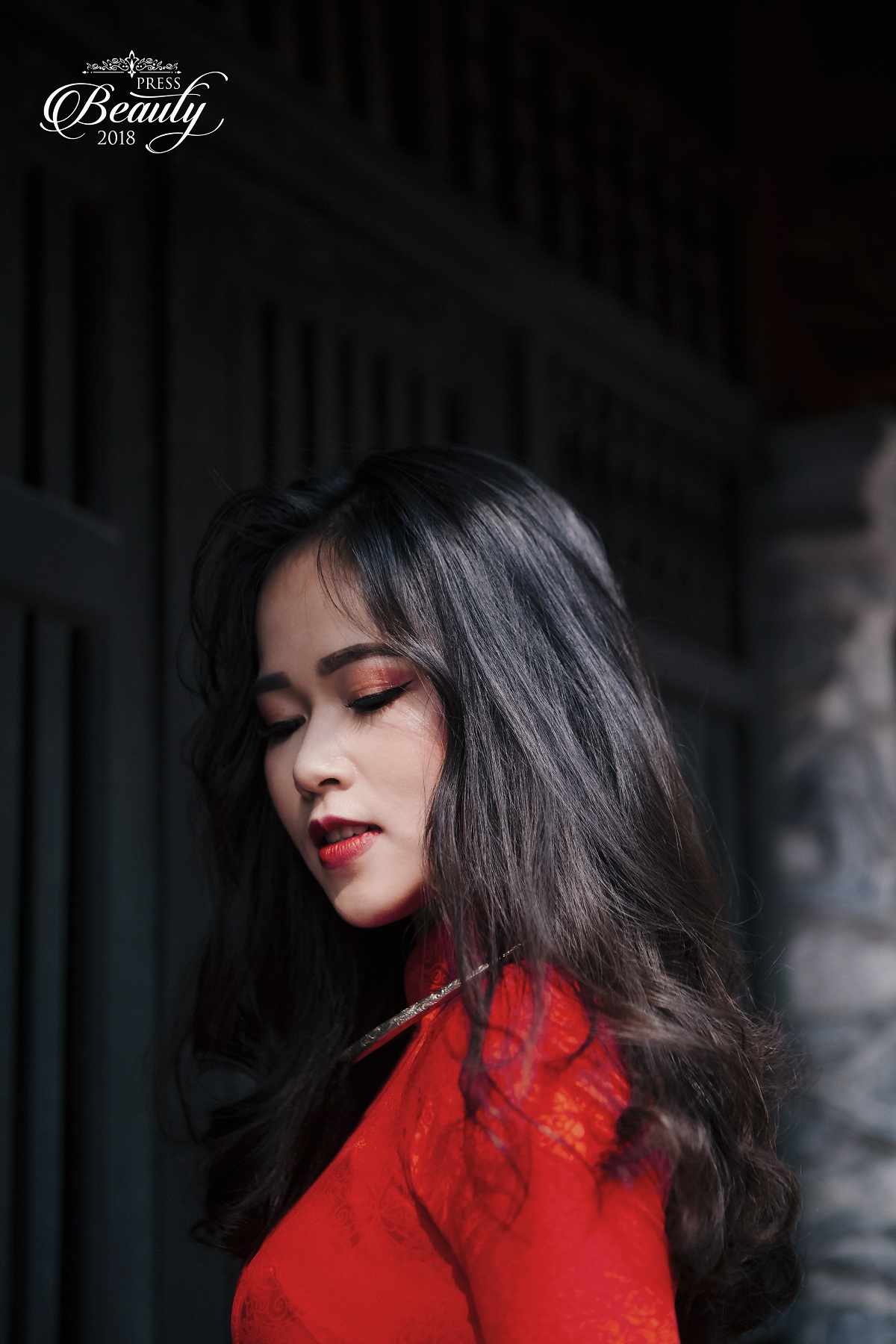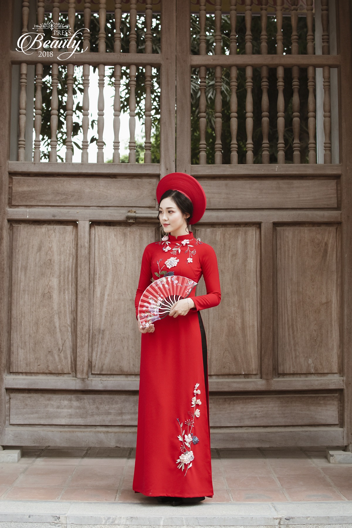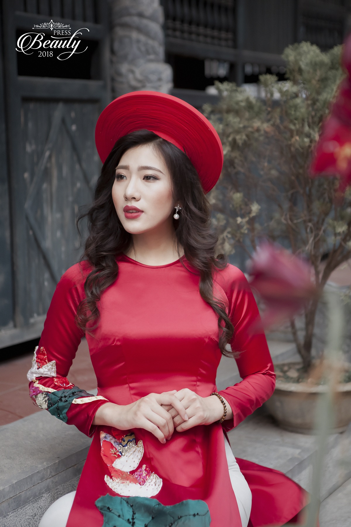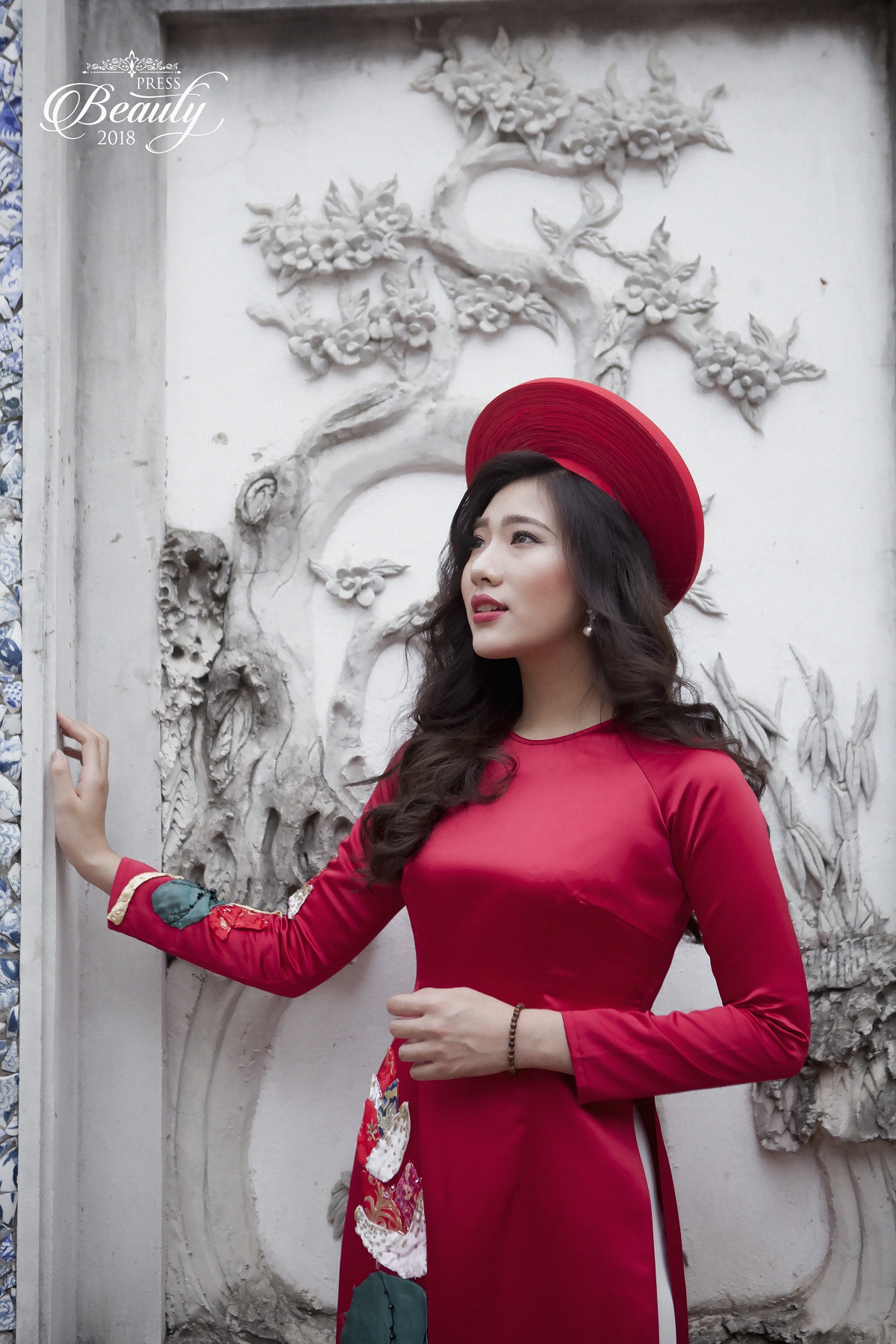 Với trang phục áo dài đỏ đã tôn lên nước da trắng của Phương Anh. Ngoài ra, sự rạng rỡ, tươi mới của cô sinh viên năm nhất này cũng khiến người đối diện bị thu hút.