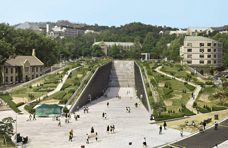 Công trình kiến trúc nổi bật nhất ở đây là ‘Ewha Campus Complex’ (ECC) - hệ thống tòa nhà ngầm 4 tầng, được xem là công trình ngầm lớn nhất tại Hàn Quốc. Đặc biệt, khi đến thăm trường Ewha vào dịp mùa thu, sinh viên chắc chắn sẽ rất ấn tượng bởi khung cảnh hiện ra đẹp như một bức tranh vẽ.