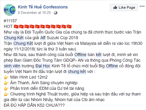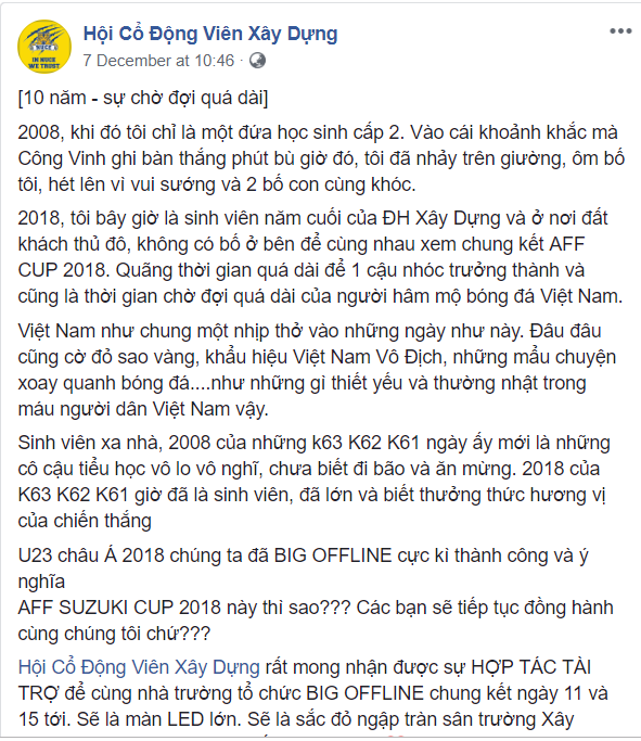 Thông báo kêu gọi tài trợ cho buổi offline trận Chung kết lượt đi được các bạn sinh viên phát đi ngay sau khi ĐT Việt Nam đánh bại Philipines trên sân Mỹ Đình. Nếu như mọi chuyện diễn ra theo đúng dự kiến, rất có thể vào tối mai 11/12, sinh viên ĐH Xây Dựng sẽ có cơ hội bùng nổ cùng đội bóng áo đỏ.