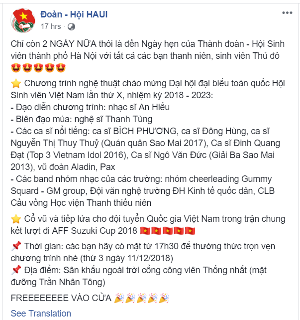 Ngoài ra,, trong ngày mai Thành đoàn - Hội Sinh viên thành phố Hà Nội sẽ tổ chức chương trình nghệ thuật chào mừng Đại hội đại biểu toàn quốc Hội Sinh viên Việt Nam lần thứ X, nhiệm kỳ 2018 - 2023 kết hợp cổ vũ và tiếp lửa cho đội tuyển Quốc gia Việt Nam trong trận chung kết lượt đi AFF Suzuki Cup 2018 . Thời gian dự kiến bắt đầu từ 17h30 thứ 3 ngày 11/12/2018.Địa điểm: Sân khấu ngoài trời cổng công viên Thống nhất (mặt đường Trần Nhân Tông).